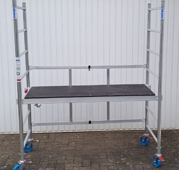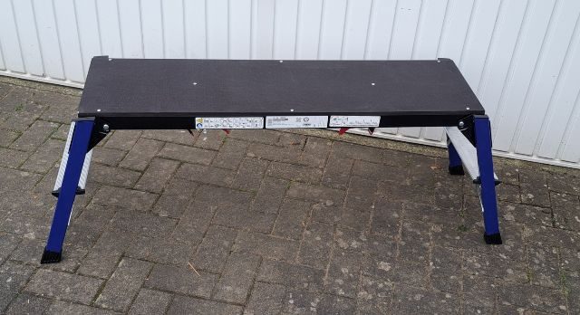 Belagbühne mit leichtgängigem Schnellverschluss kann am zusammengeklappten Gerüst für den Transport und platzsparende Lagerung senkrecht eingehängt werden